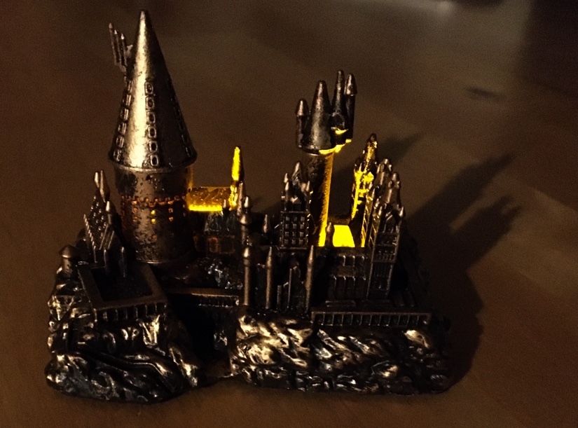 It comes well packaged and is easy to assemble, basically, all you have to do is add the tops of the two main towers and you are done; and sitting on your desk will be a small, but surprisingly detailed, bronze coloured model of Hogwarts Castle that really does light up; I’ve tweaked the main picture a little bit to give you an idea of what it looks like when it lights up.