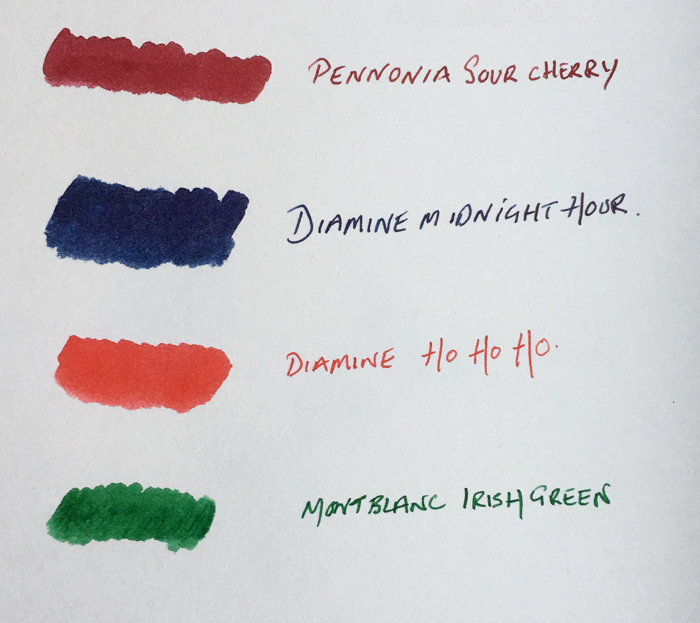 Diamine Blue Edition Ho Ho Ho – Whilst I have no doubt this one was inspired by Mr Clause it is also the same colour as the berries on a Holly bush or the feathers on a Robin.