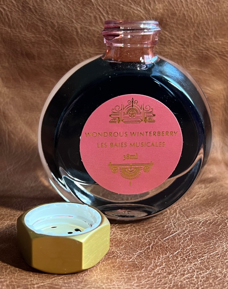 Wondrous Winterberry is the perfect Christmas ink either as a gift for someone or as your sparkling Christmas ink. What makes it a Christmas ink is the packaging; Ferris Wheel Press have created a wonderful predominantly red festive red box with gold foil images. The bottle is circular but not spherical and has their signature brass hexagon nut cap.